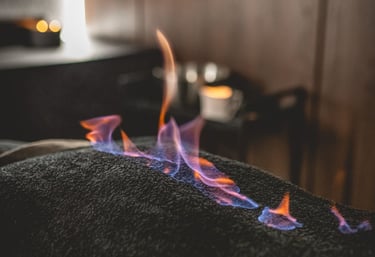 Soin par la chaleur utilisant une serviette enflammée pour activer la circulation et soulager les tensions